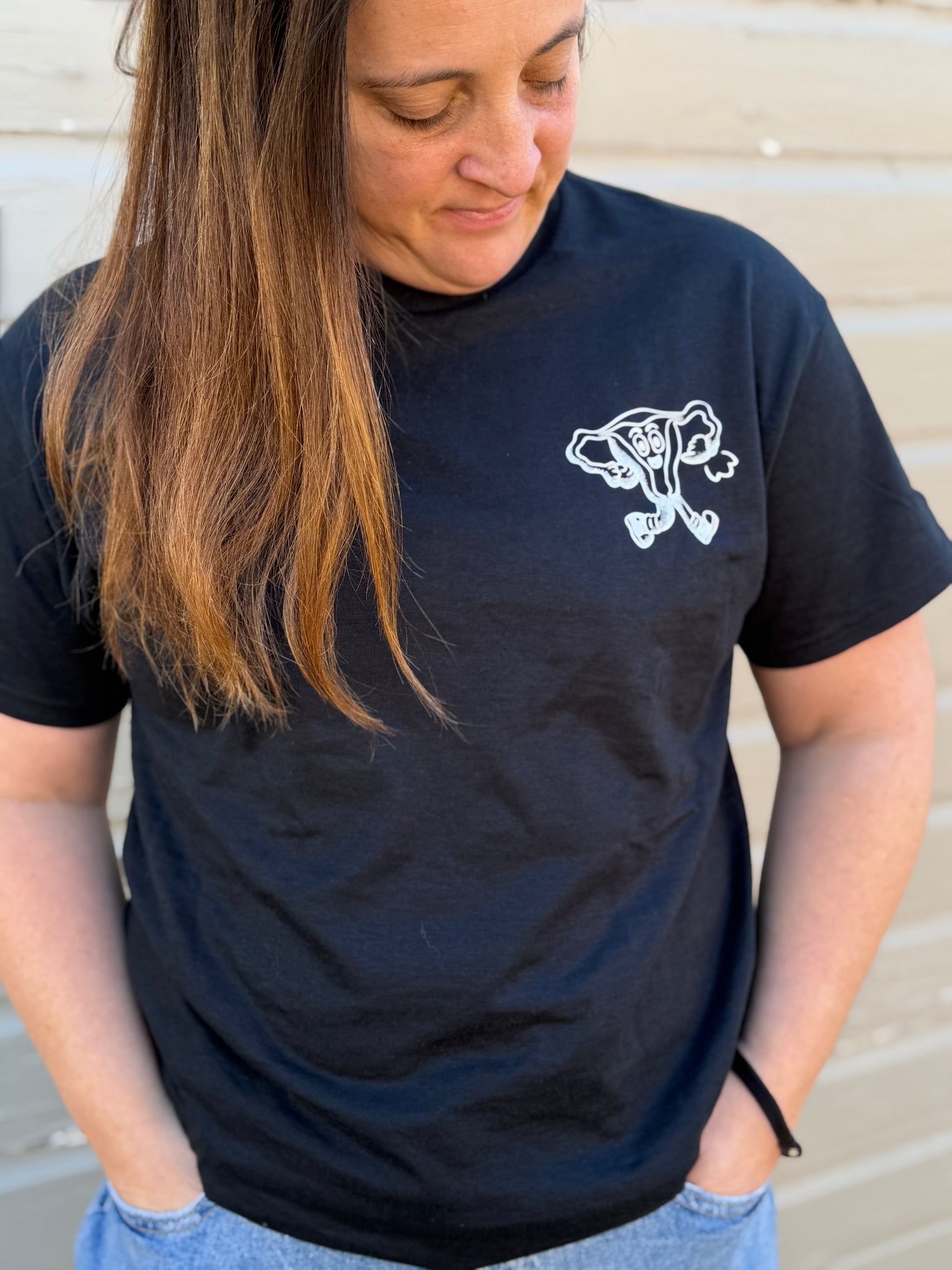 The back of the shirt features a cartoon-like uterus with the words, "Ask Me About My Uterus!" A smaller version of the uterus image without words is included on the front of the shirt. Sweatshirts also include a special bonus message on the sleeve! (NOTE: The sleeve message is NOT included on t-shirts.) All shirts come with an information card that contains resources for learning more about adenomyosis and uterine fibroids. This shirt was designed through a collaboration with Iowa-based artist, Caitlyn Chellew. Her work addresses the complexities of identity and public perception through a feminist lens. Find more of Caitlyn's art at caitlynchellew.com.