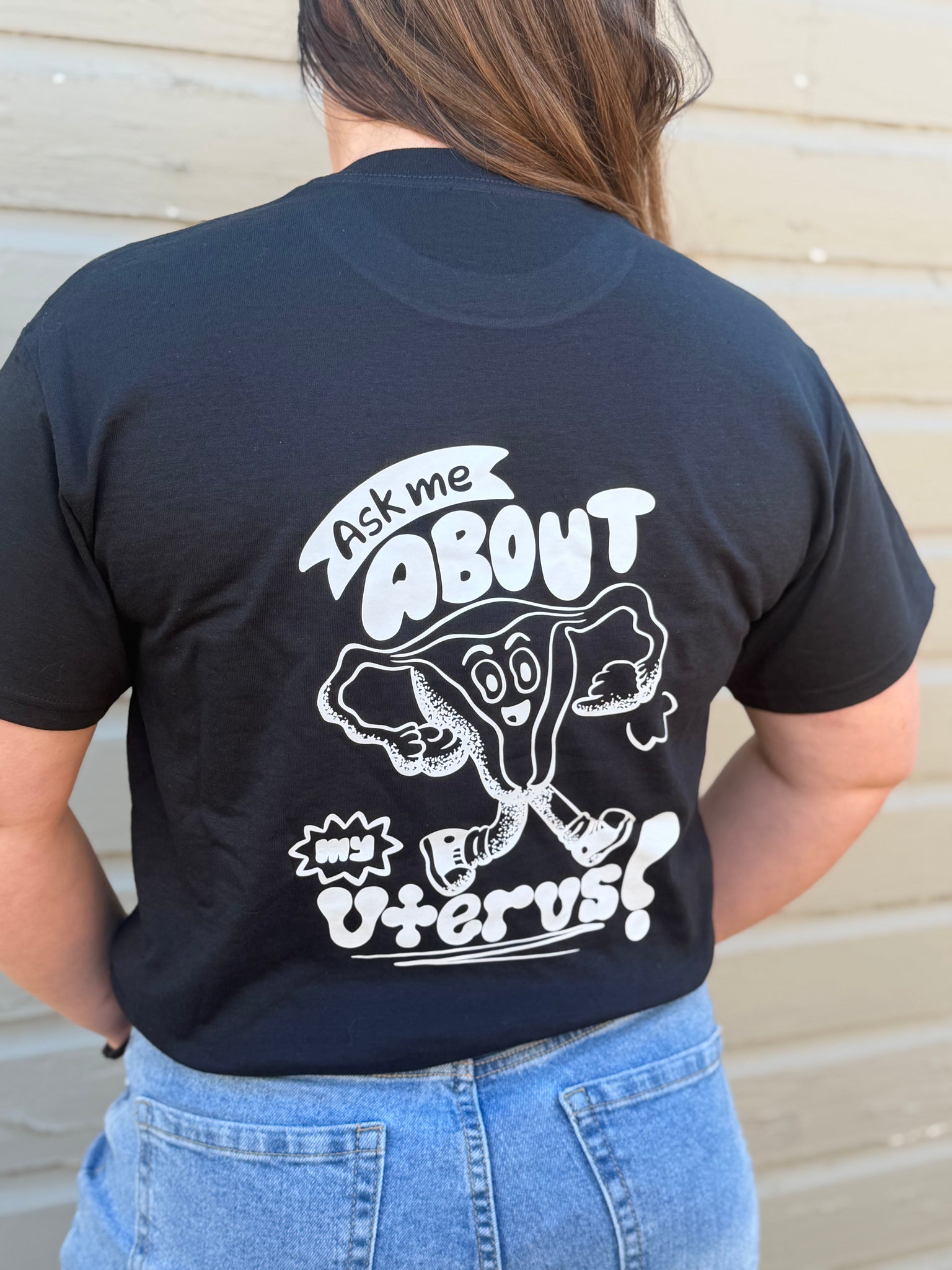 Are you someone who lives with adenomyosis or uterine fibroids? Or do you love someone who does? This shirt is for you! Designed to help generate awareness about these painful, debilitating medical conditions that affect the uterus, our "Ask Me About My Uterus" shirt is the perfect conversation starter. And bonus! It also gives back. For each shirt purchased, 10% of proceeds are donated to individual GoFundMe campaigns for people with adenomyosis and uterine fibroids, providing much needed financial assistance to seek care and support themselves.